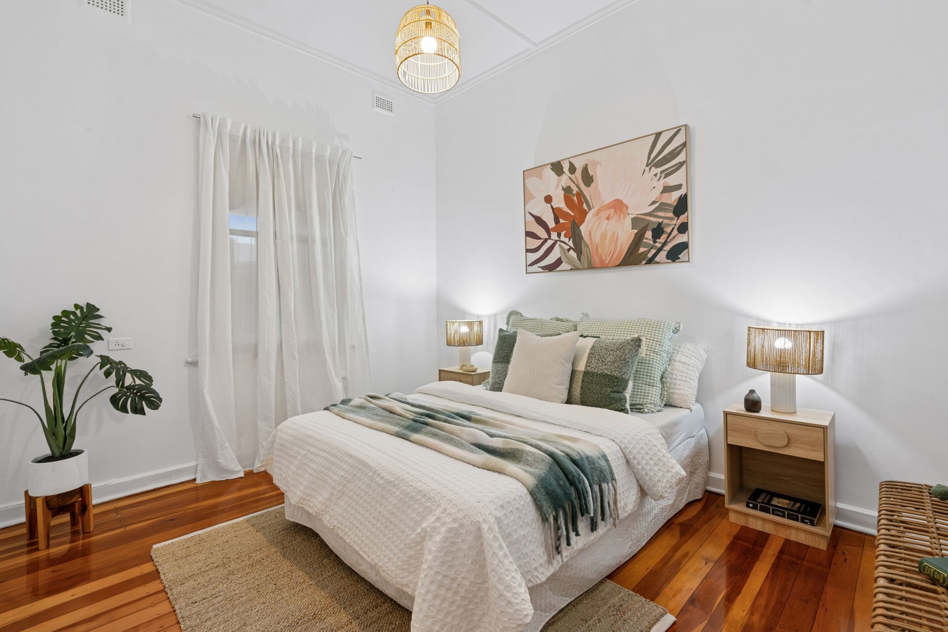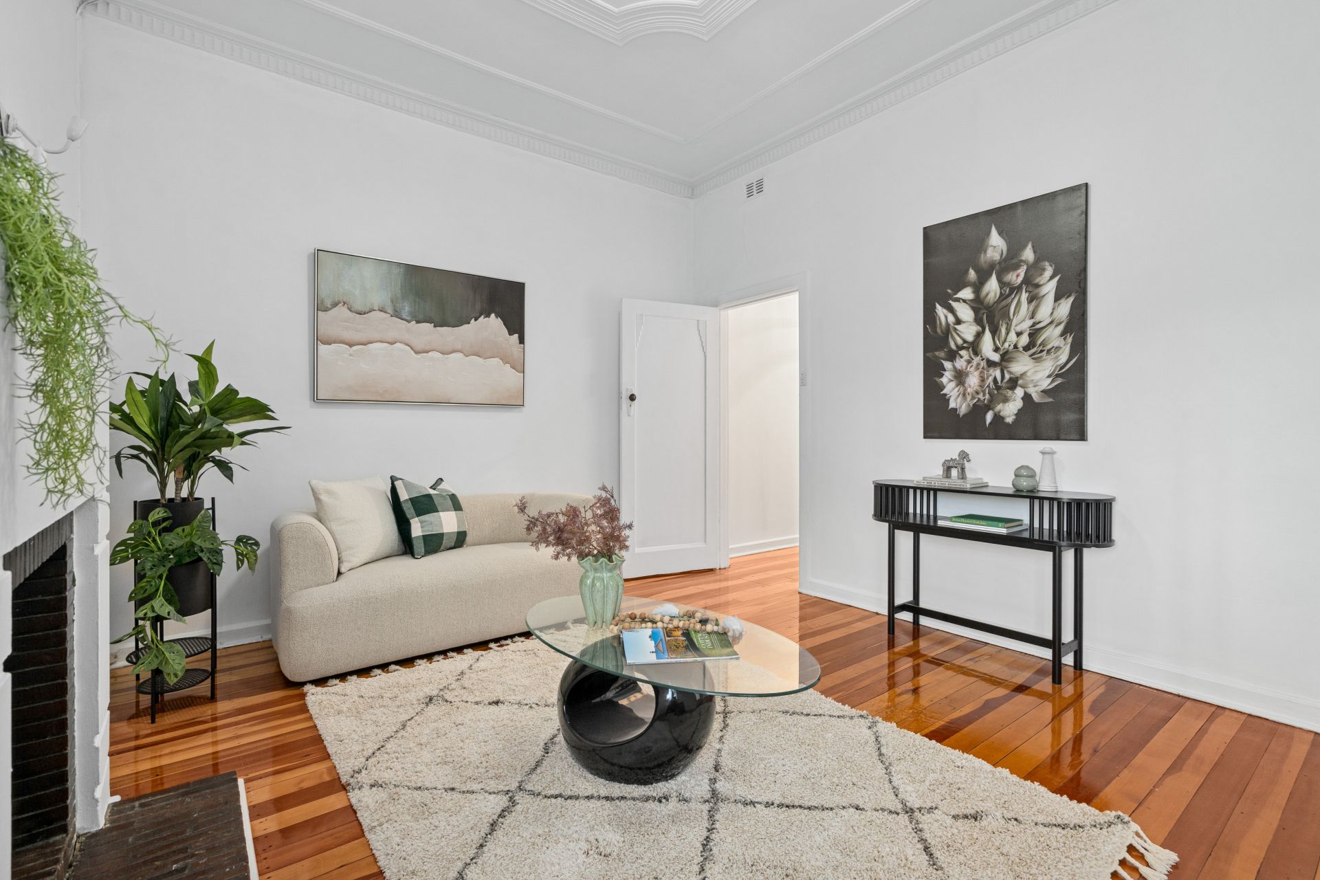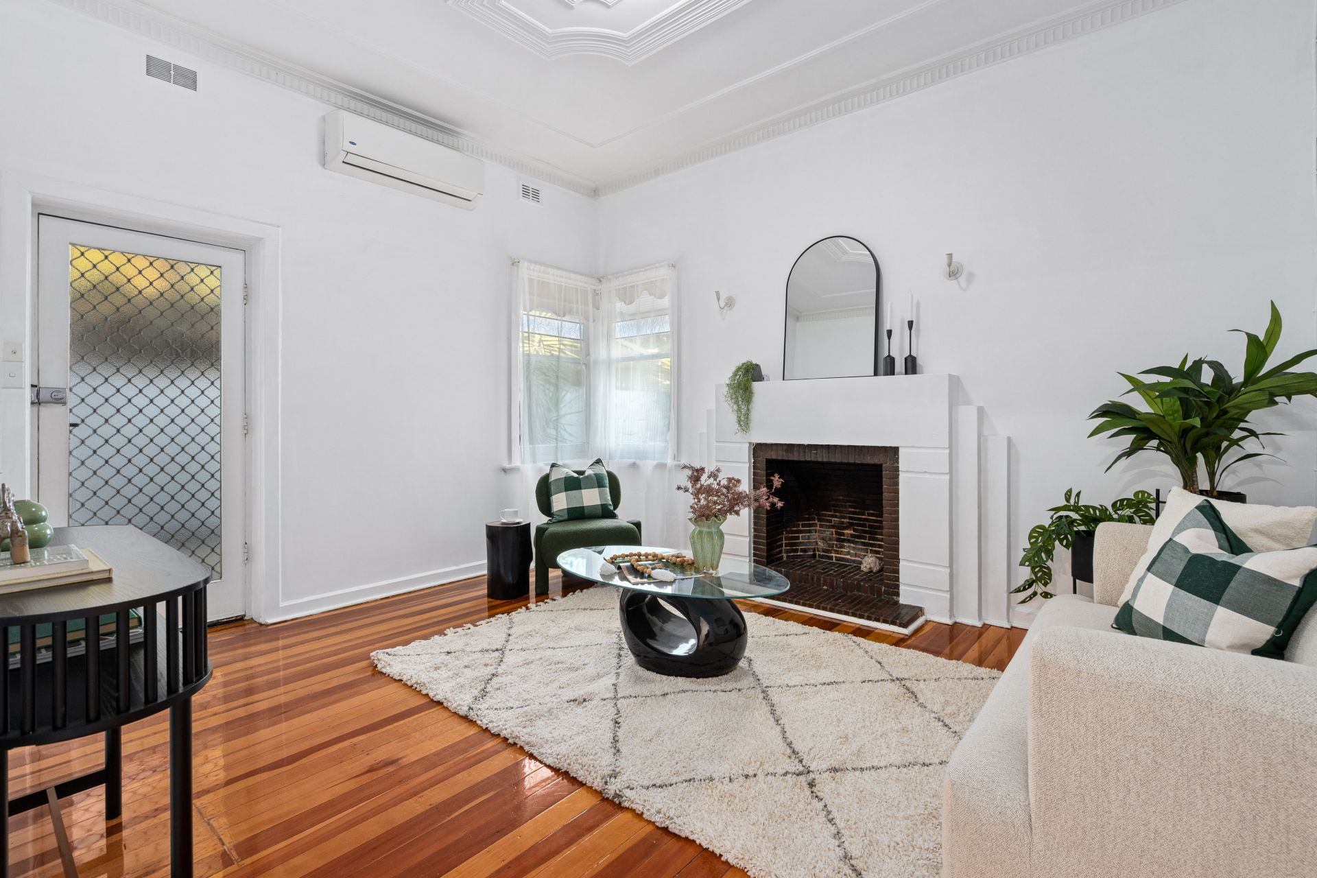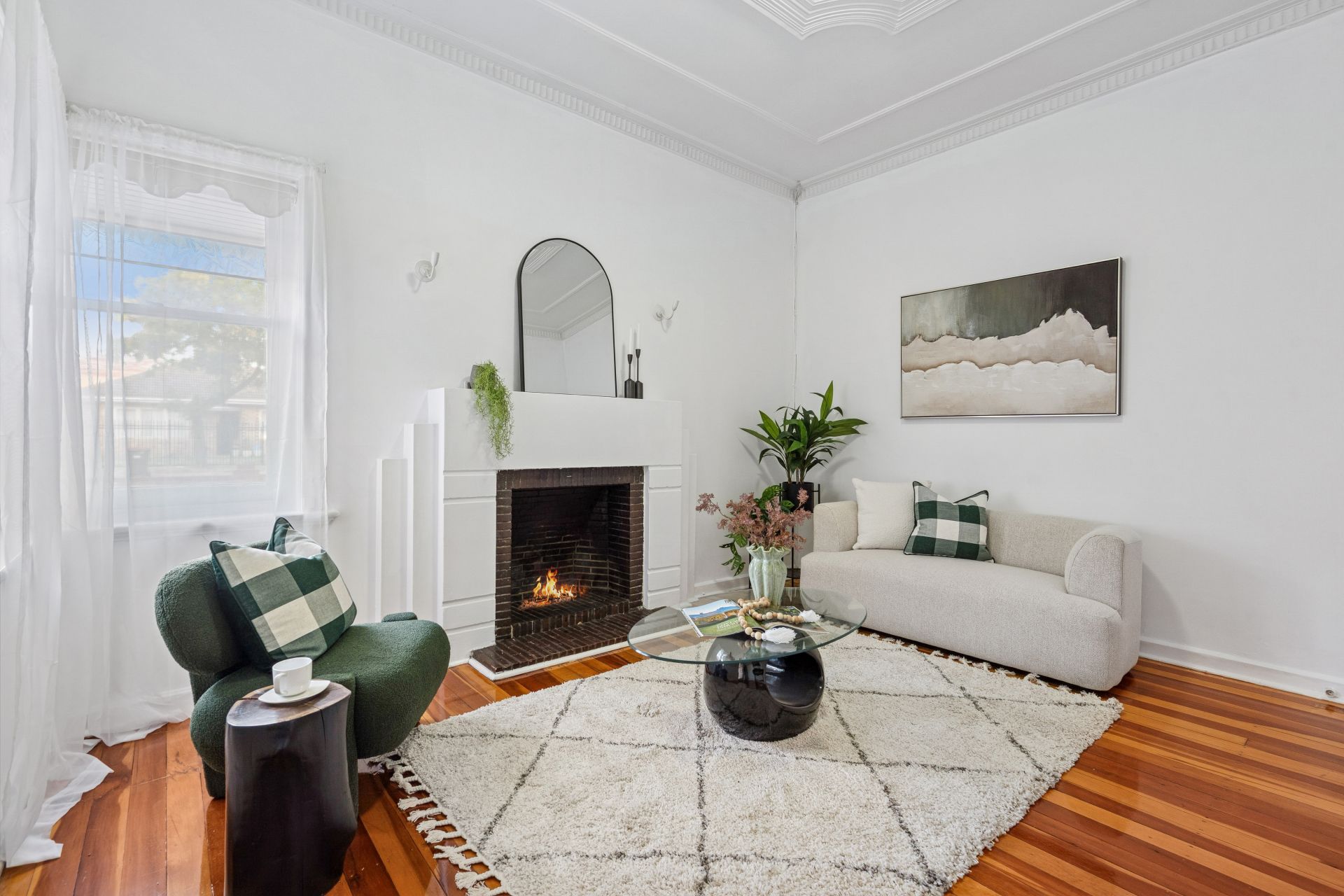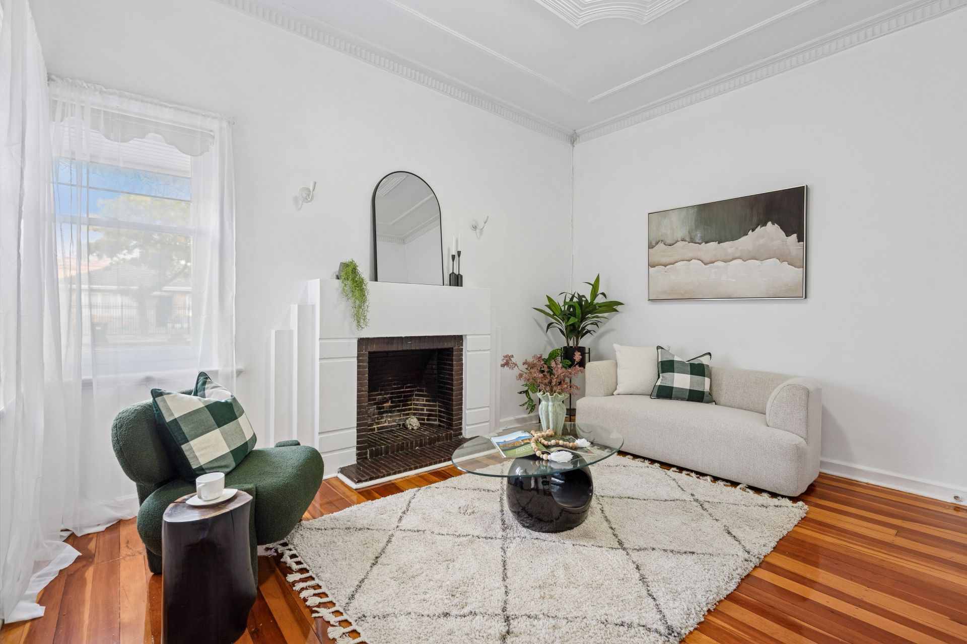 Upon entry, you are welcomed by polished timber floorboards, high ceilings of approximately 3 metres, and a light-filled interior that enhances the sense of space throughout. The spacious lounge is centred around a charming feature fireplace*, creating a cosy and inviting atmosphere perfect for relaxing or entertaining.